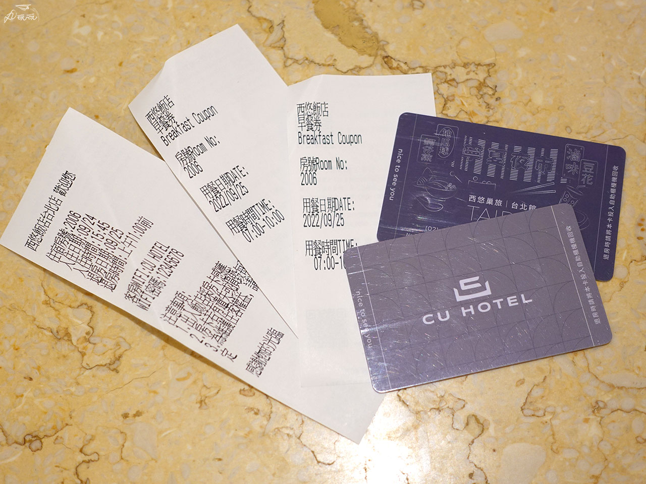 照著步驟輸入訂房資訊成功自助報到後,將從自助機台取得2張房卡和明細,若有選擇帶早餐方案也會同時提供早餐券喔!