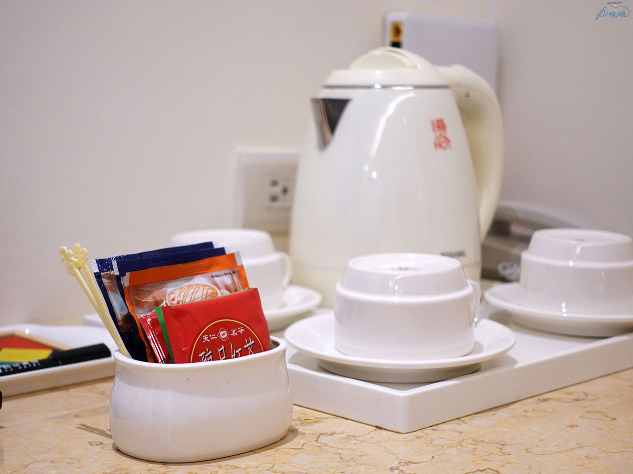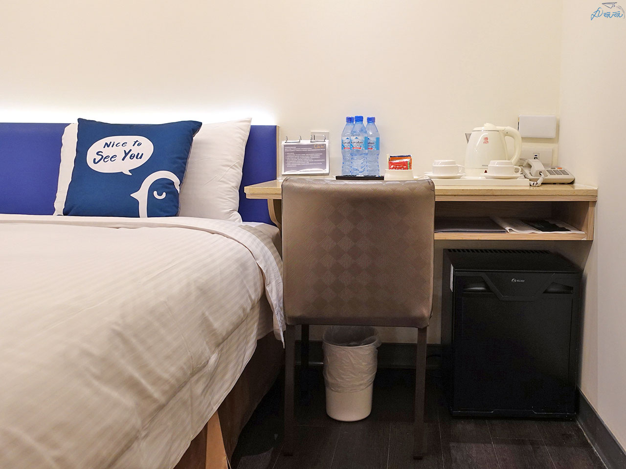 房內一側的桌位區,可作為歇息區或辦公區,並帶有小冰箱、電湯匙、礦泉水、咖啡茶包、紙拖等…備品,基本該有的一樣都沒少。