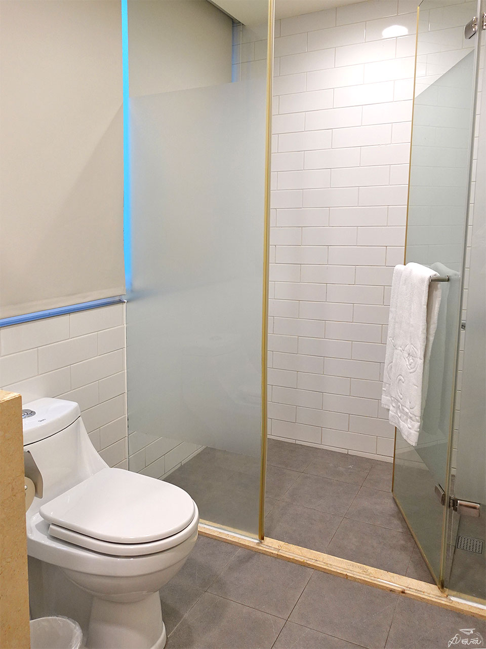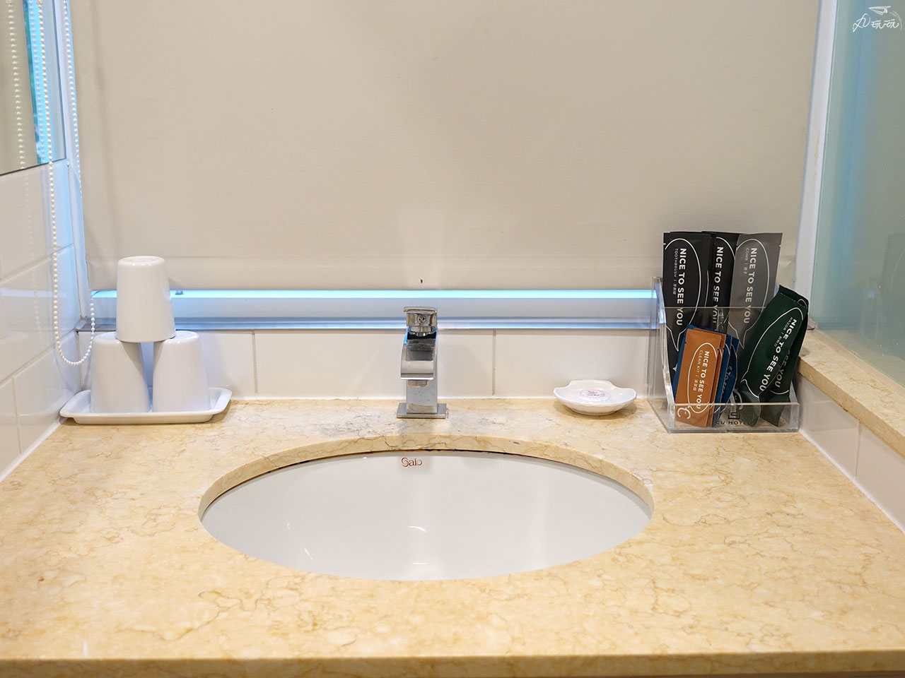 衛浴間採乾濕分離,水量大小適中熱水瞬熱速度也快,洗一個舒舒服服的熱水澡沒有問題。整體衛浴空間不僅通透明亮也十分寬敞,雖然不帶浴缸卻是我住過的旅店中,衛浴空間與客房比例相比數一數二大的呢!