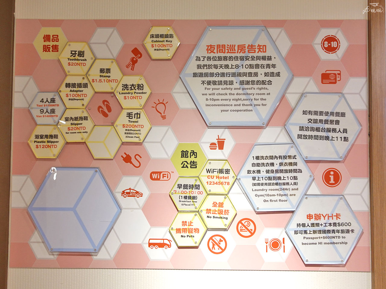 館內相關的注意事項或者有備品方面的需求,在廊道上的公佈欄上都有明確的資訊。