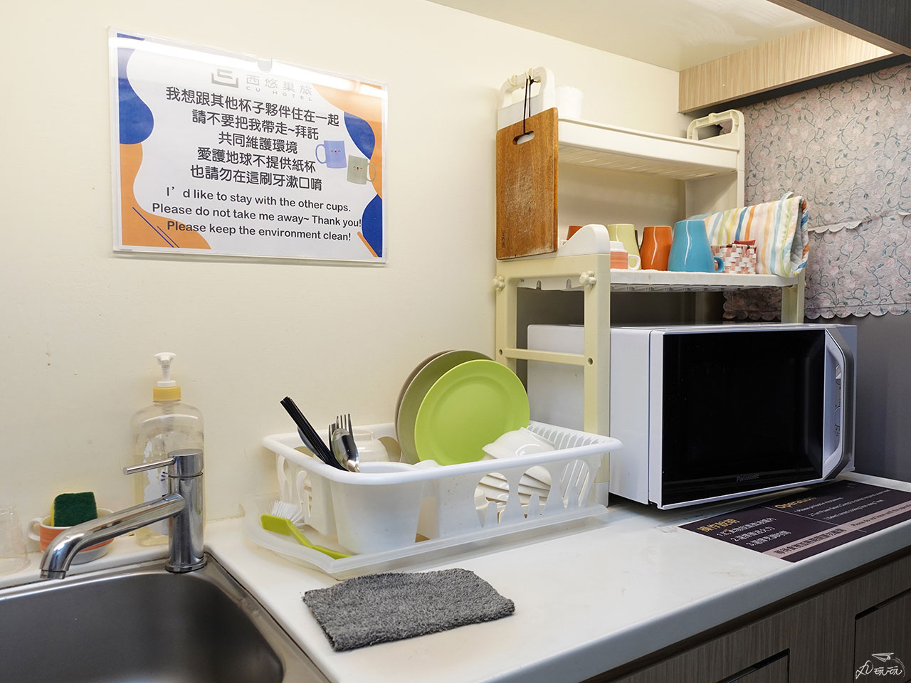由於台灣在吃的方面太過便利選擇又多加上負擔得起的物價,房客多半選擇直接在外解決而非自行下廚,因此不像國外的青年旅館將廚房設為重點。不過旅店還是提供微波爐及簡易的餐具,顯得格外貼心。