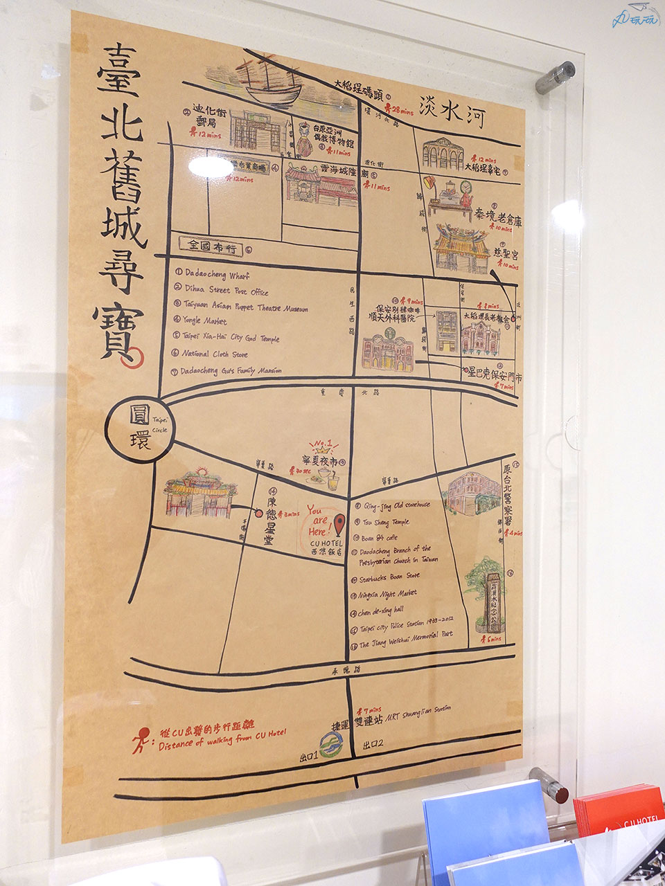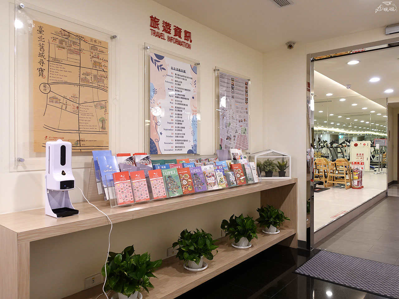 接著回到一樓公共空間。這片旅遊資訊牆搜集了許多旅店附近的景點、美食和台北活動資訊以及各國語言的台北簡介,不妨將腳步停留下來看看在地人都推薦了什麼。