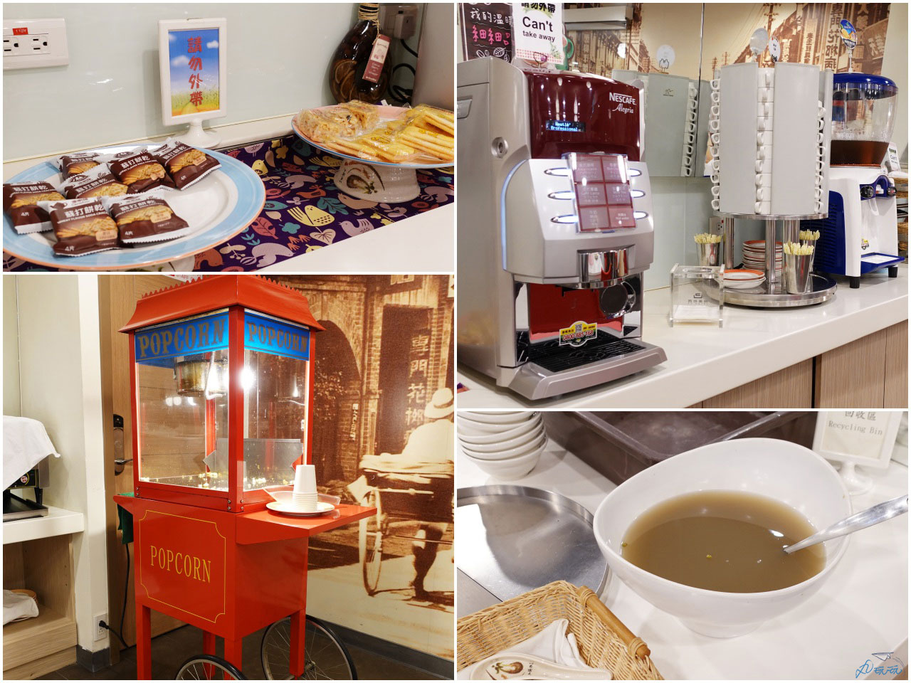 餐廳區明亮座位數多,這裡除了在早晨提供自助早餐,每天晚上6:00-9:30則是點心吧時間。免費提供房客餅乾、零食、爆米花、綠豆湯、咖啡機台和果汁飲品自助取用,是不是很佛心呢?外食想帶回旅店的餐廳享用,也沒有問題喔!《查看房價&訂房》