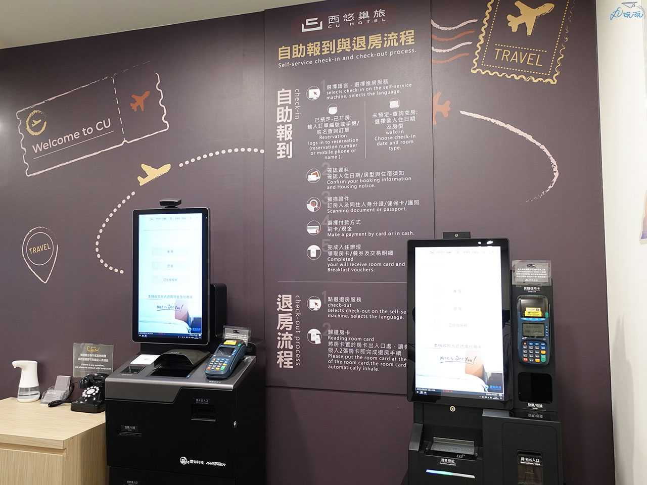 初到者,使用一旁的通話機與旅店人員進行溝通便可入內,接著於入住時間下午3點後即可於左手邊的自助報到機進行check in。操作過程中如有遇到任何問題,都可使用一旁的電話即時聯繫旅店人員,屆時都有人員會現身協助。