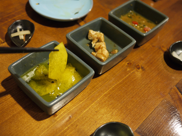 餐廳內部挺特別的,地下2樓挑高,從外面看很難想像店家還有如此意外的空間格局。主要是日式料理定食、丼飯、烏龍麵、咖哩飯和一些日式小點。我們坐在地下一樓。每桌都會提供小菜,吃完還可以續喔!!