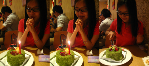吃到一個段落,店員端著蛋糕走到我們桌前,整家店也開始播著生日快樂歌,又把感性的陳秋萍弄得一把眼淚一把鼻涕!沒想到這綠油油的蛋糕卻踩中秋萍的地雷,這蛋糕被唾棄的很。這告訴我們買巧克力蛋糕準沒錯!!