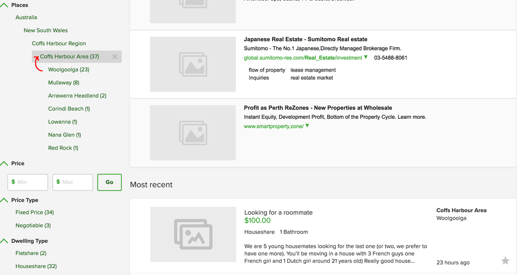 我以woolgoolga舉例,woolgoolga列在Coffs Harbour Area中,其附近還有其他小鎮相距並不遠,可使用googlmap查看。有車好辦事,那沒車的人恩…請自行想辦法(跑走)。旺季真的非常難找房,有時可以先求有再求好,到了當地後再換房也比較容易搶得先機!